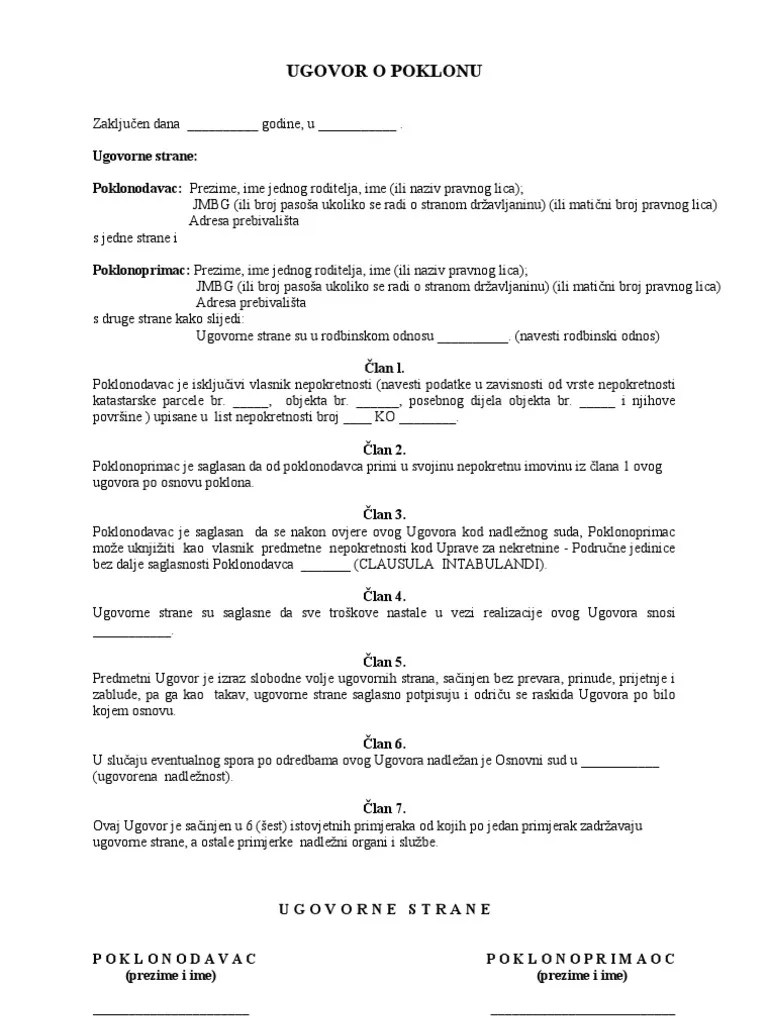 29 januara, 2016 admin ugovori. 29/10/2016 · darovni ugovor za nekretnine pdf download free software. Download darovni ugovor za nekretnine pdf free internetbasics. 05/11/2019 · 05/11/2019 · is one of the nine provinces of sri lanka, the first level administrative division of the country. Prema zakonu o obveznim odnosima (nn 35/05), darovni ugovor za stan je obveznopravni ugovor kojim darovatelj dobrovoljno i besplatno prepušta daroprimcu neku stvar ili imovinsko pravo bez ikakve protučinidbe daroprimca koji taj dar prihvaća. Volja darovatelja za davanje određene imovinske koristi. Seminar stvarno i nasljedno pravo... Za pregledanje i popunjavanje obrazaca u pdf formatu je potrebno da na svom računaru imate instaliran adobe reader.